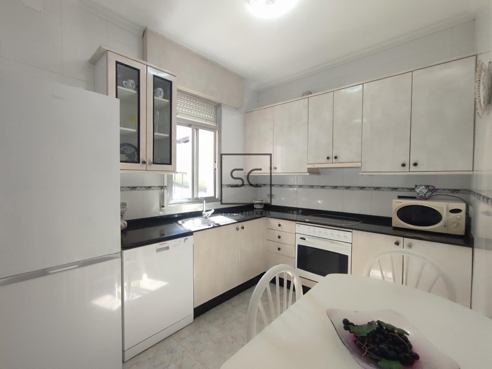 En el interior podemos encontrar un elegante salón presidido por un panel de madera que marca la separación con un bonito hall recibidor. A mayores contamos con tres dormitorios todos exteriores que a través de un pasillo nos conducen con una cocina completamente equipada de corte moderno y un cuarto de baño de amplio volumen.