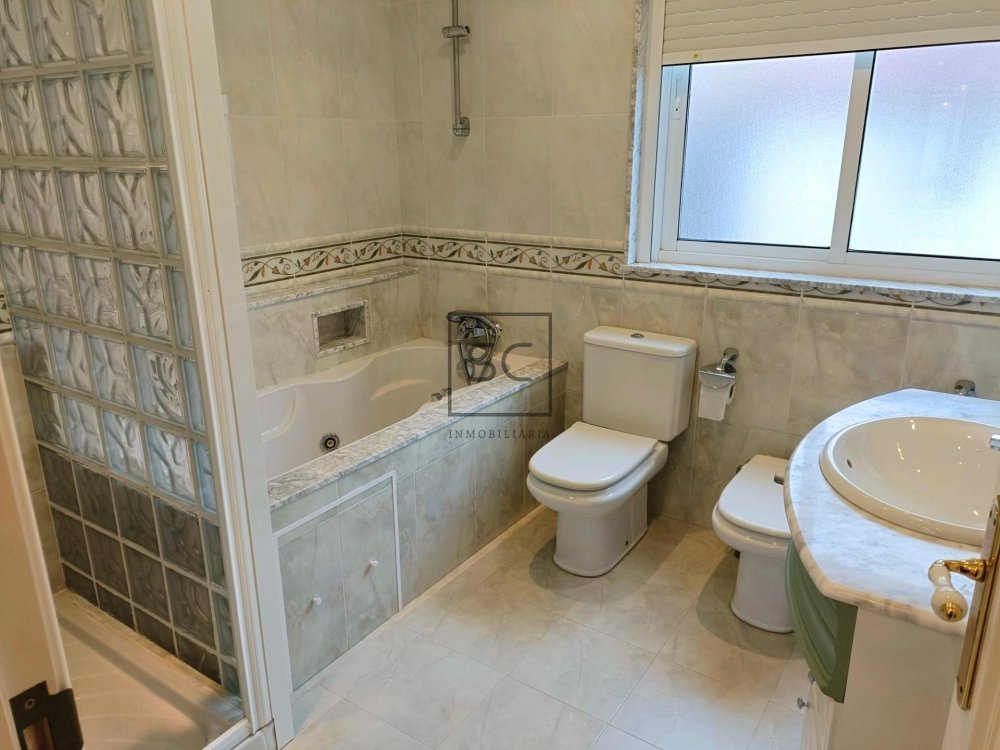 Planta primera: Desde ese hall en la planta baja tendremos acceso a las escaleras que nos llevarán a su zona de descanso en el primer piso donde veremos un baño con plato de ducha y su columna de hidromasaje, cuatro habitaciones dobles llenas de luz natural, una de ellas con armario empotrado y baño propio con plato de ducha y bañera de hidromasaje.