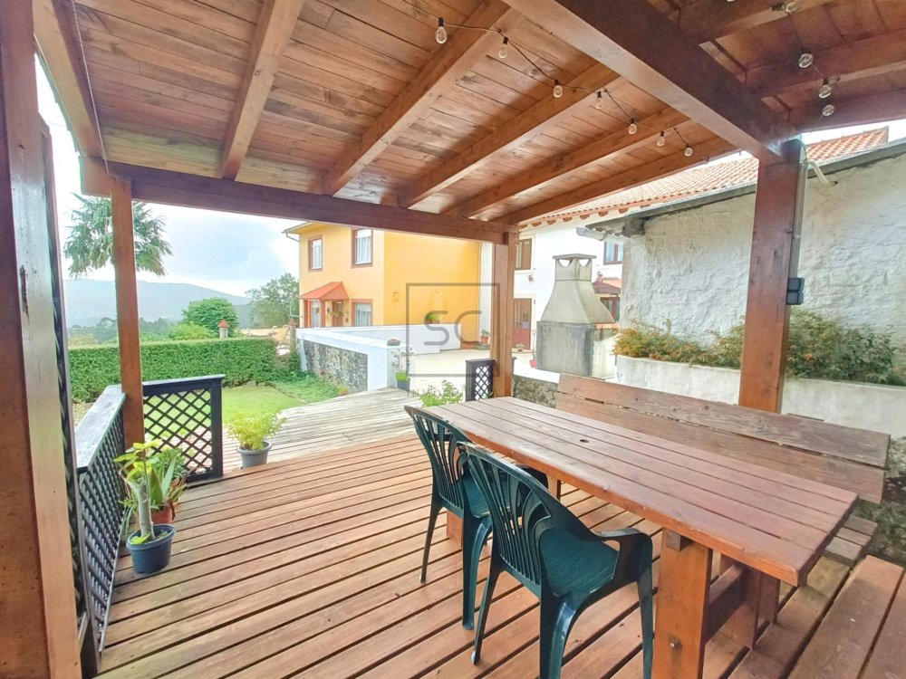 La parcela de 200 metros cuadrados, completamente cerrada, es un verdadero oasis de paz. Dispone de un patio y una pequeña zona verde. El cenador de madera, con impresionantes vistas al entorno rural, es el lugar perfecto para relajarse y disfrutar de las comidas.